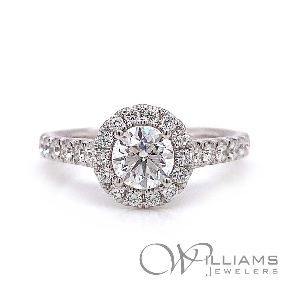 Williams Signature 14 Karat White Gold Diamond Halo Complete Ring with a center .50 Carat Round G-H Color, SI2 Clarity Diamond and .50 Carat Total Weight Round G-H Color, SI2 Clarity Diamonds, Size 7