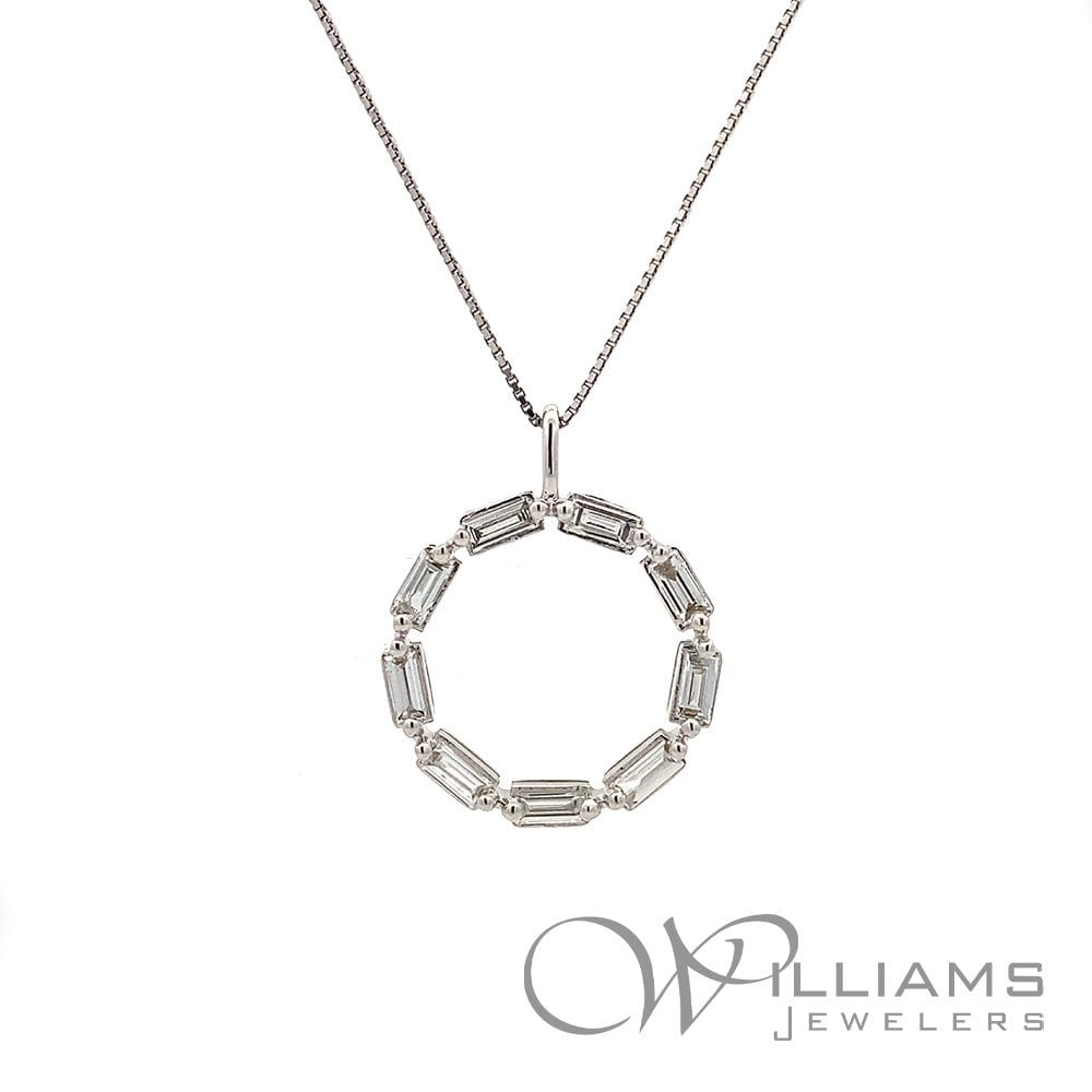 Williams Signature 14 Karat White Gold Diamond Circle Pendant Necklace with 9=.37 Carat Total Weight Baguette Cut G-H Color, VS2-SI1 Clarity Diamonds. 18 Inches in Length