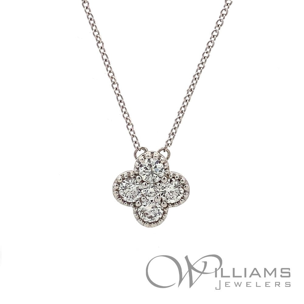 Williams Signature 14 Karat White Gold Quatrefoil Diamond Pendant Necklace with 5=.50 Carat Total Weight Round G-H Color, SI2 Clarity Diamonds. 16-18 Inch Adjustable Chain