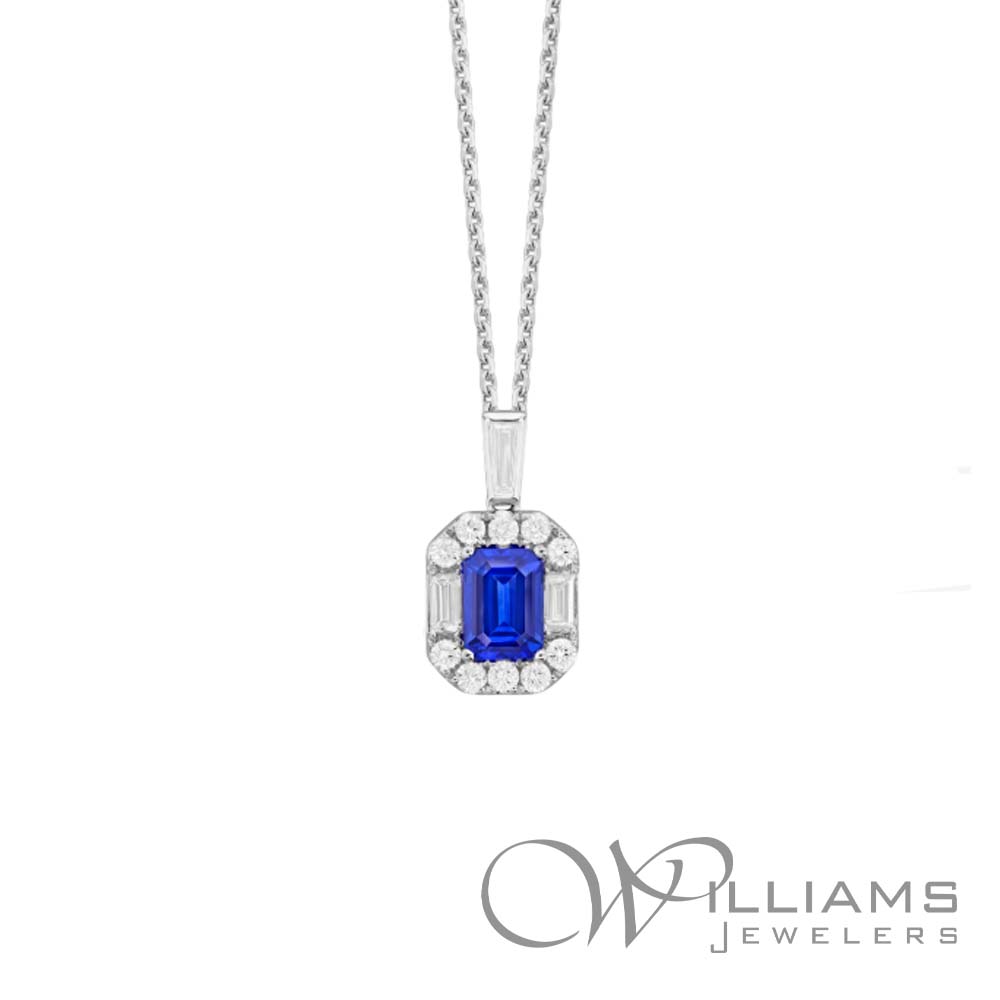 Williams Signature 18 Karat White Gold Blue Sapphire and Diamond Pendant with a 1.21 Carat Total Weight Emerald Cut Sapphire and .61 Carat Total Weight Round and Baguette G-H Color, VS Clarity Diamonds, on a 18 Inch Chain