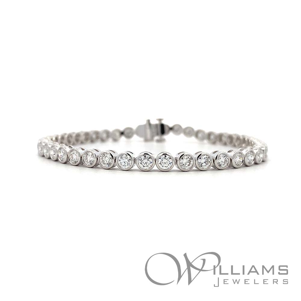 Williams Signature 18 Karat White Gold Diamond Bezel Set Tennis Bracelet with 43=5.00 Carat Total Weight Round G-H Color, VS Clarity Diamonds. 7 Inches in Length