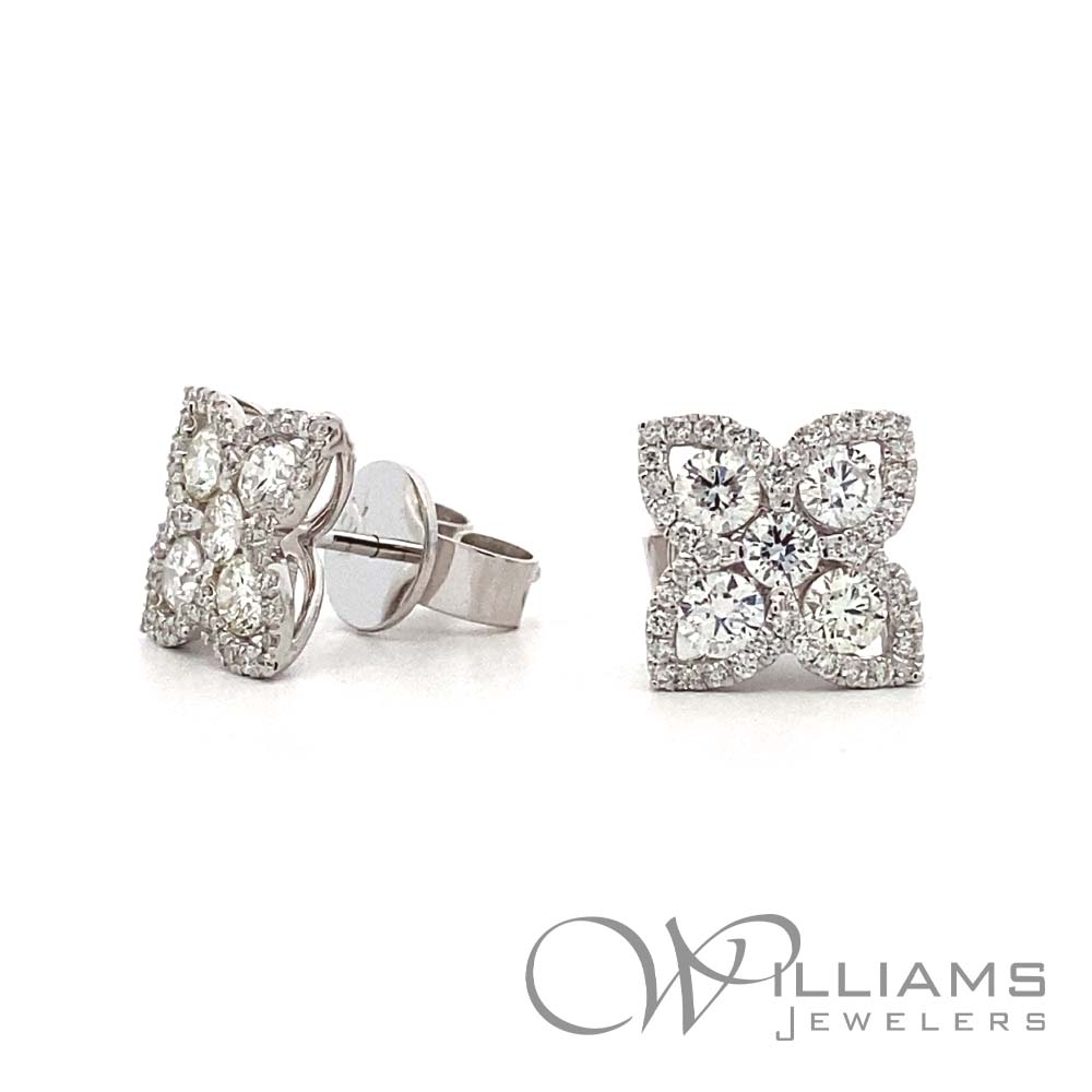 Williams Signature 18 Karat White Gold Diamond Flower Stud Earrings with 90=.95 Carat Total Weight Round G Color, VS2 Clarity Diamonds.