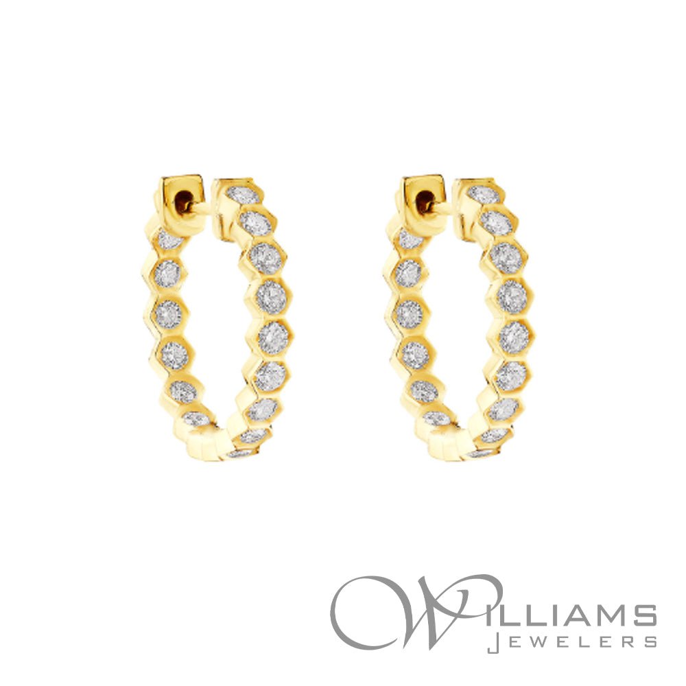 Williams Signature 18 Karat Yellow Gold Diamond Inside-Outside Hexagon Bezel Hoop Earrings with 32=.72 Carat Total Weight Round G-H Color, SI Clarity Diamonds.