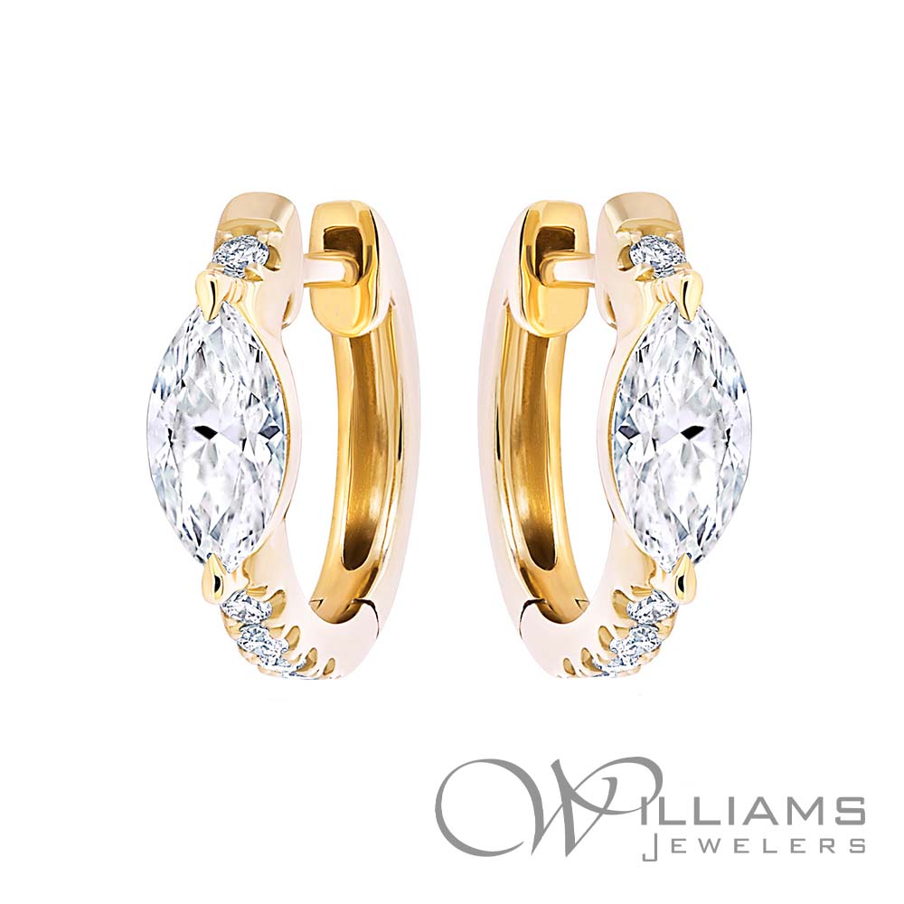 Williams Signature 18 Karat Yellow Gold Diamond Huggie Hoop Earrings with with 2=.60 Carat Total Weight Marquise Cut G-H Color, SI Clarity Diamonds and 10=.10 Carat Total Weight Round G-H Color, SI Clarity Diamonds.