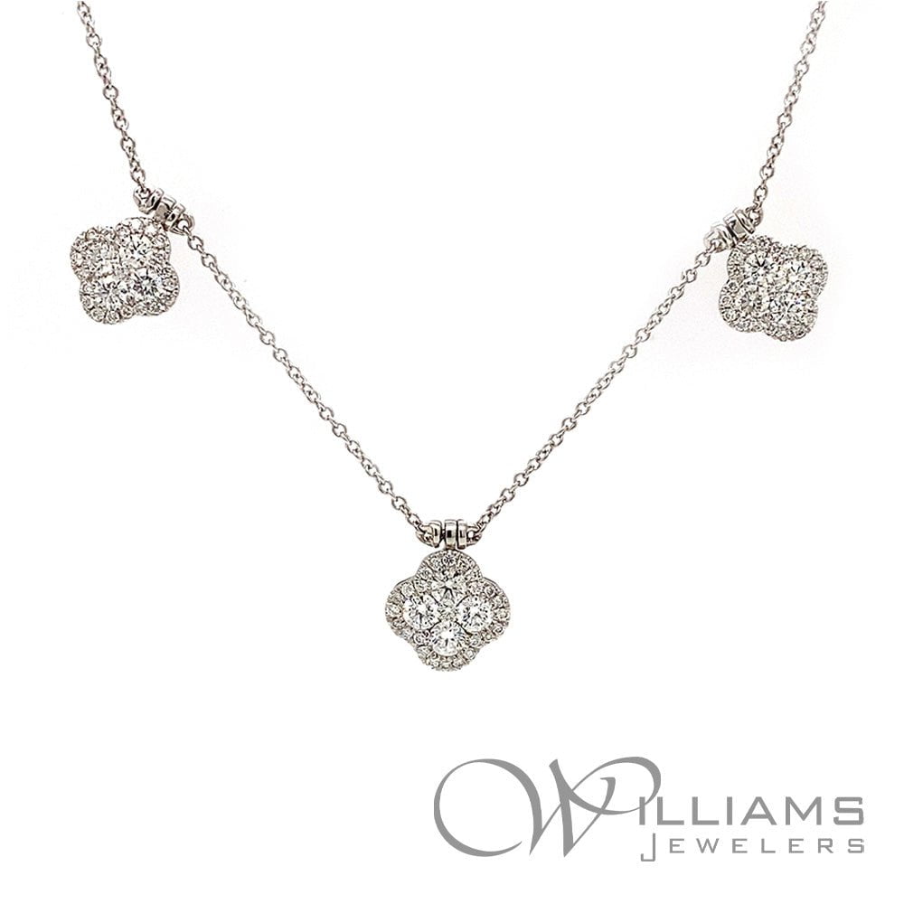 Williams Signature 18 Karat White Gold 5 Station Diamond Cluster Necklace with 129=1.11 Carat Total Weight Round G Color, VS2 Clarity Diamonds. 18.5 Inch Adjustable Chain