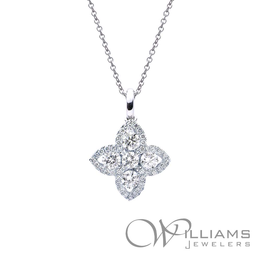 Williams Signature 18 Karat White Gold Diamond Flower Pendant Necklace with 45=.46 Carat Total Weight Round G Color, VS2 Clarity Diamonds. 18 Inches in Length