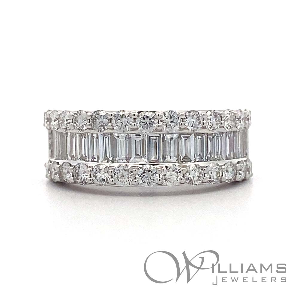 Williams Signature 18 Karat White Gold Diamond Ring with 20=.81 Carat Total Weight Baguette G Color, VS2 Clarity Diamonds and 26=1.00 Carat Total Weight Round G Color, VS2 Clarity Diamonds. Size 6.5
