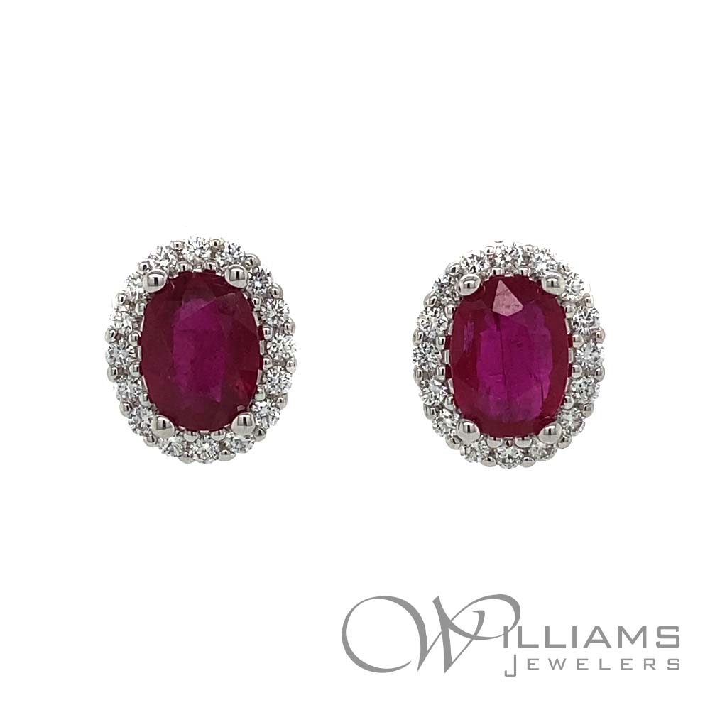 Williams Signature 18 Karat White Gold Ruby & Diamond Halo Stud Earrings with 2=2.62 Carat Total Weight Oval Rubies (GIA# 2181371035) and 32=.46 Carat Total Weight Round G-H Color, VS Clarity Diamonds