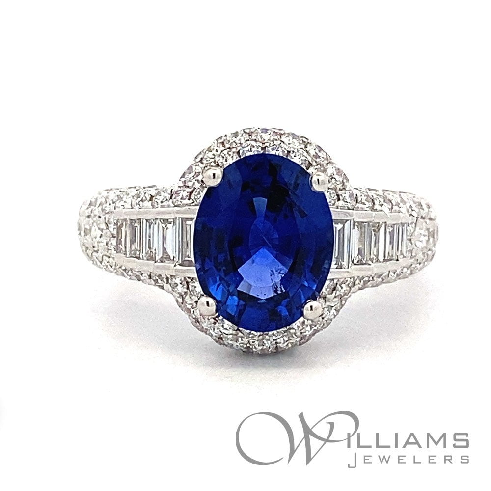 Williams Signature 18 Karat White Gold Sapphire and Diamond Ring with a center 2.20 Carat Oval Cut Sapphire and 1.44 Carat Total Weight Round G-H Color, VS Clarity Diamonds. Size 6.5