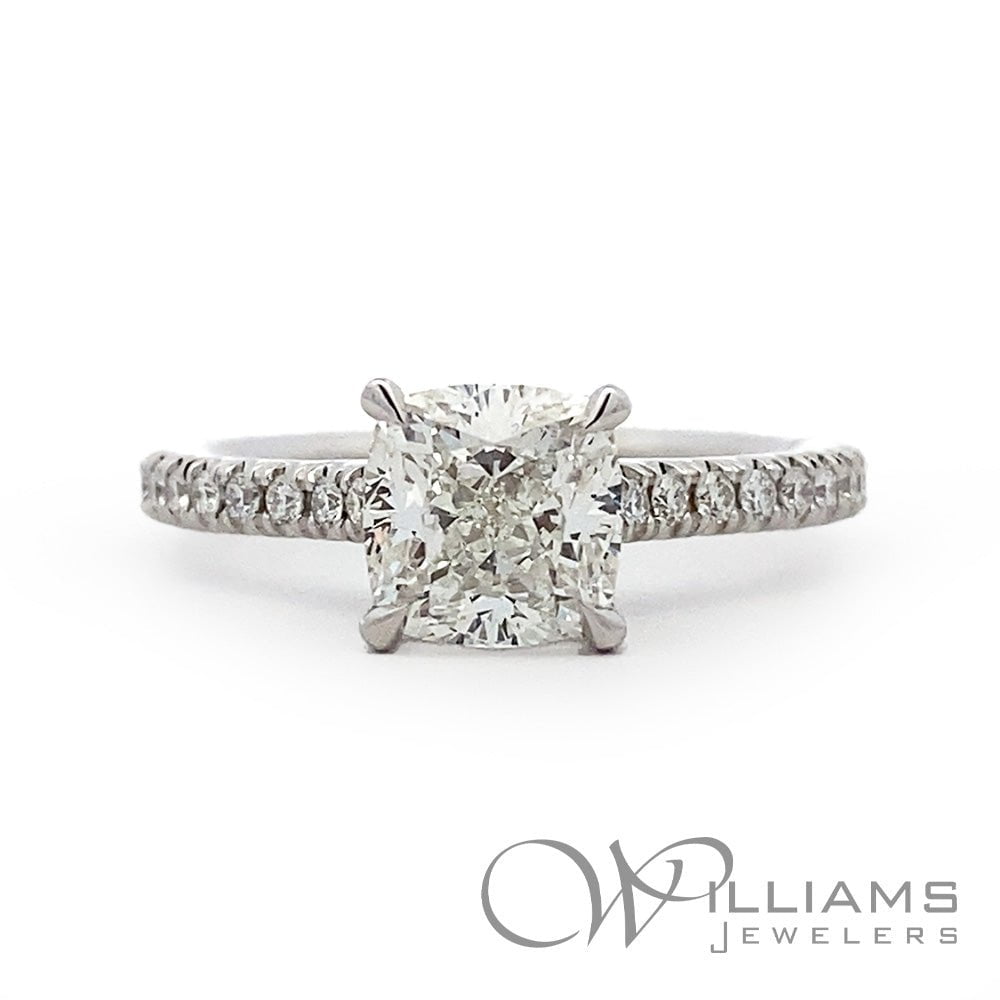 Williams Signature Platinum Cushion Diamond Complete Ring with a center 1.74 Carat Cushion I Color, SI1 Clarity Diamond (GIA# 1166831076) and 32=.37 Carat Total Weight Round G-H Color, VS Clarity Diamonds, Size 6.5
